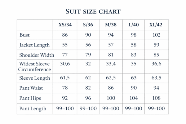 The carefully selected fabric composition provides an ideal balance between elegance and durability. Natural wool adds softness, breathability, and a premium look, while polyester helps the suit maintain its shape and improves resistance to wrinkles.